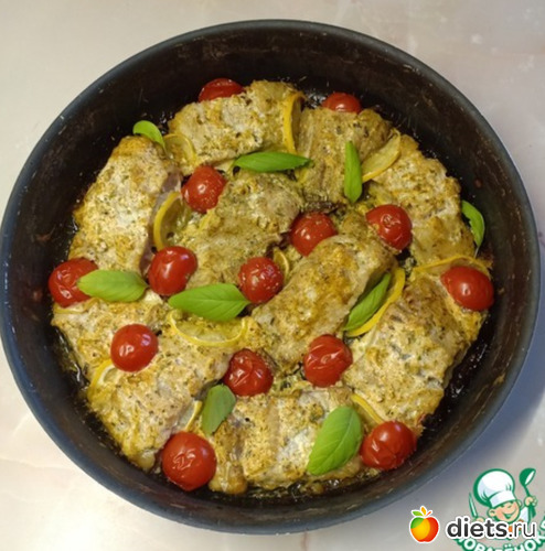 Форму с рыбой поставить на 25-30мин в духовку, заранее разогретую до 190С, затем вынуть, выложить помидоры черри, разрезанные пополам и поставить в духовку ещё на 10мин.