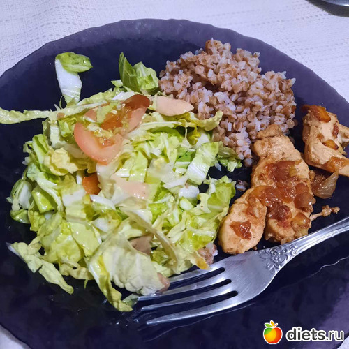 салат из пекинки и помидор и грибов (почти княжий град), курогрудь тушёная с луком и чесноком + гречка на гарнир.
