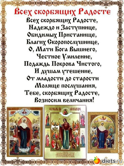 — Есть в храме Преображения Сына Моего образ Мой, именуемый «Всех скорбящих Радость». Стоит он на левой стороне в трапезе, где обыкновенно становятся женщины. Призови к себе из этой церкви священника с этим образом, и когда он отслужит молебен с водосвятием, ты получишь исцеление.