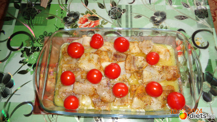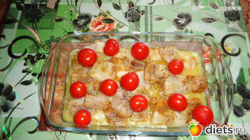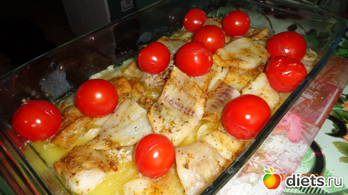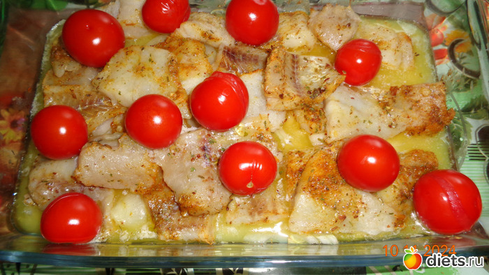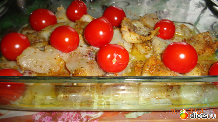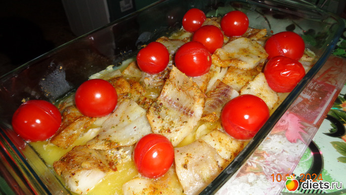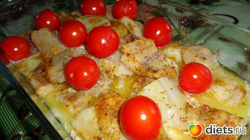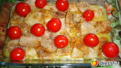 10. Через 20 мин. вынуть рыбку, добавить нарезанные помидорки, и снова поставить форму в духовку на 10 мин, сняв фольгу. Если вы будете запекать в фольге, помидорки можно не добавлять.