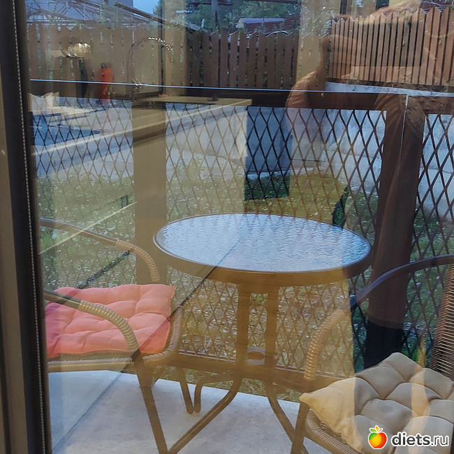 душевая кабинка, туалет, раковина с зеркалом, балкон со столиком и стульями.