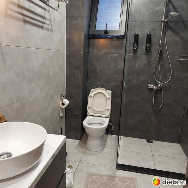 душевая кабинка, туалет, раковина с зеркалом, балкон со столиком и стульями.