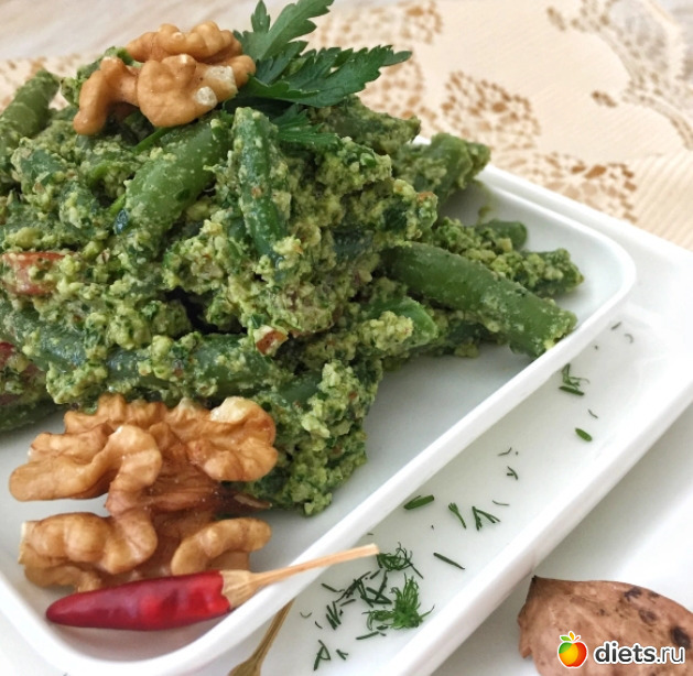 6. В глубокой миске перемешиваем фасоль, помидоры и орехо-зеленую пасту.
