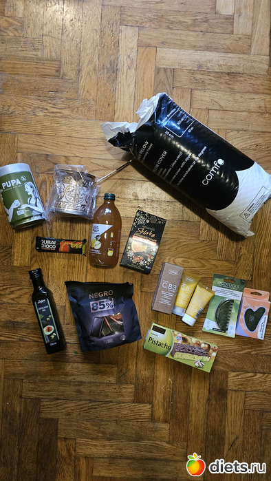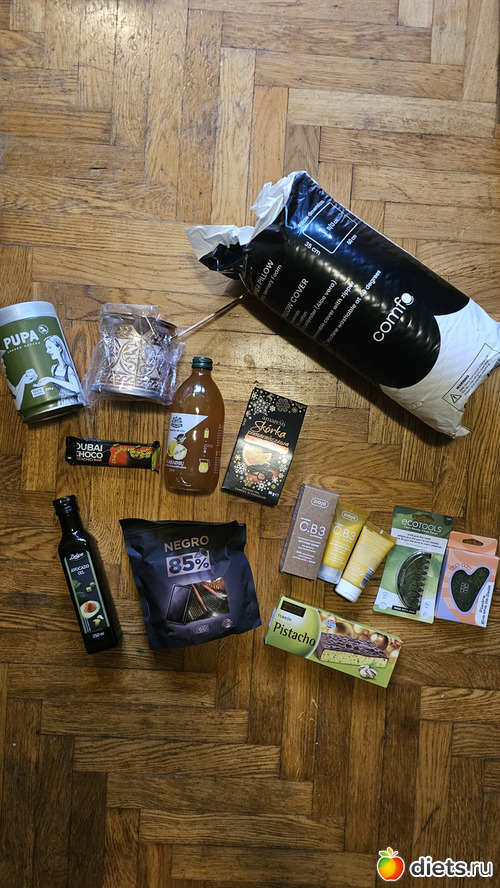 Весь ее набор выглядит так (подушка, джезва, кофе, чайный концетрат, масло авокадо, сладости, дубайский шоколад, туррон, крсметика, скребки гуа-ша)