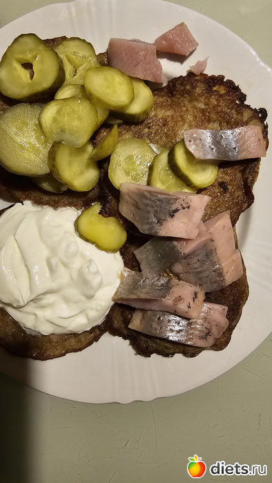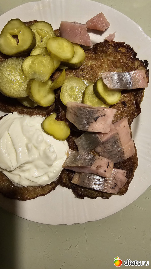 Муж готовил драники с селедкой, сметаной и маринованым огурцом