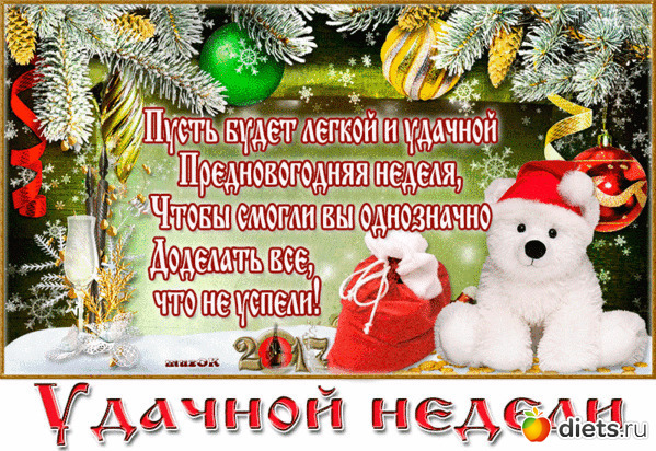 Пришло время подумать о будущем. Можно планировать отпуск, отдых на выходных, в новогодние праздники, составлять чек-листы на новогоднюю ночь. Планеты и звезды на этой неделе относительно позитивны, поэтому дела вряд ли будут срываться без причины. Лучше тратить деньги обдуманно. На выходных необходимо сделать генеральную уборку — это будет отличной подготовкой к новогодним праздникам и к окончанию года. Поднять настроение на буднях помогут гости. Можно устроить приятную встречу друзей, чтобы обсудить дела и пообщаться.