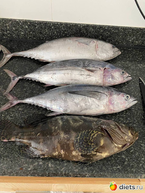 А потом купили рыбу. Три макрели и группера. Макрель большой компанией съели сырой, а я сырую рыбу не ем, поэтому приготовила себе группера. Вкусный!