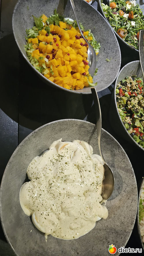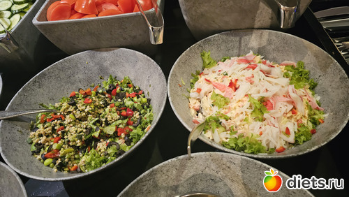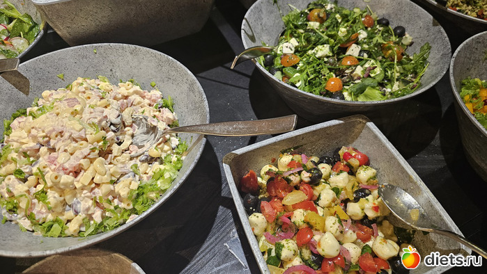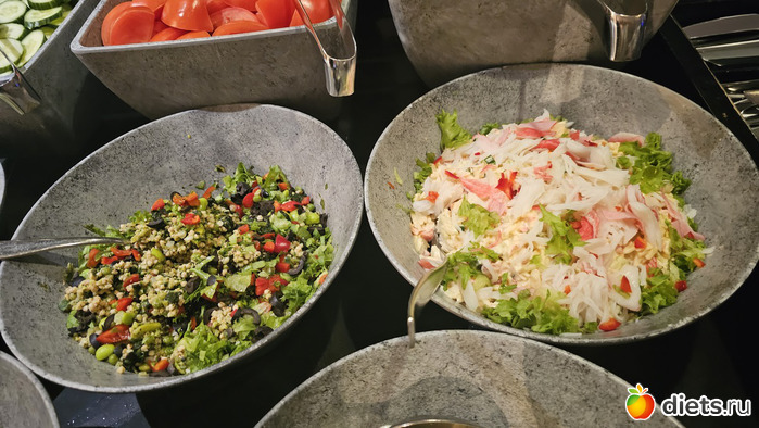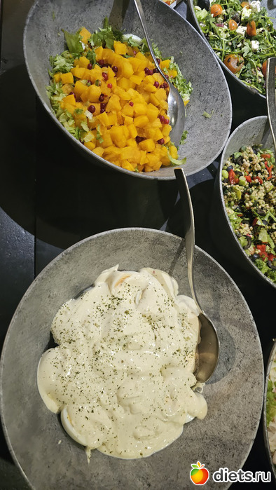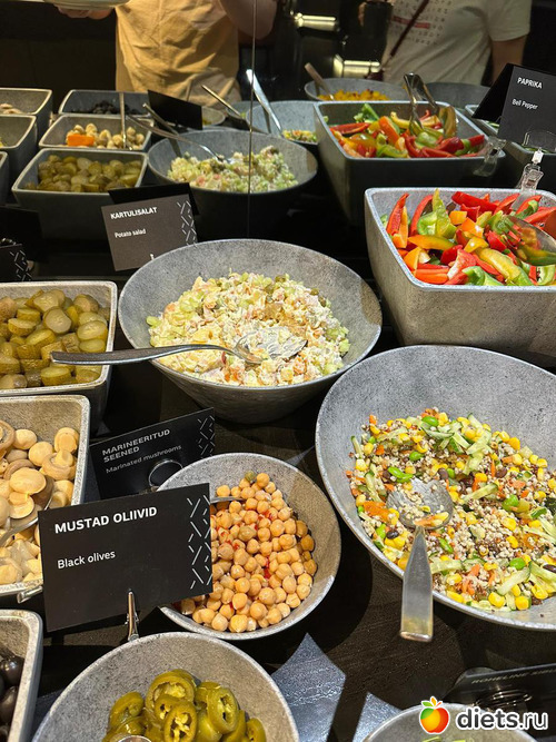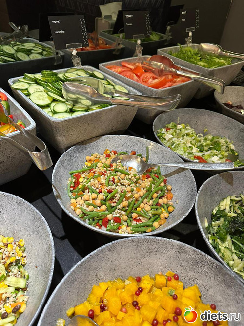 Хороший выбор салатов, даже с кускусом, макаронами, фасолью и тд. Не просто овощи нарезанные (и такие тоже были)