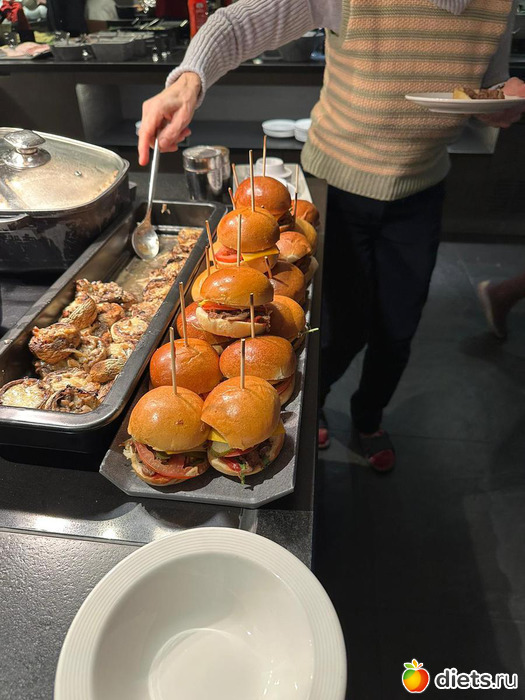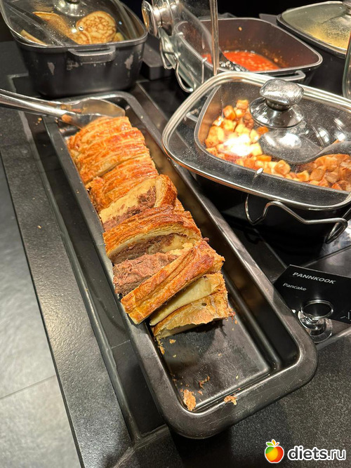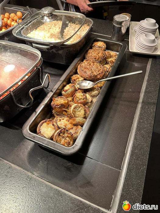 Прекрасный выбор горячих блюд: каша, омлет, вареные яйца, ветчина, фасоль, колбаски, черная кровяная колбаса, нагетсы, печеная картошка, блинчики, тушеные овощи, грибы и тд.