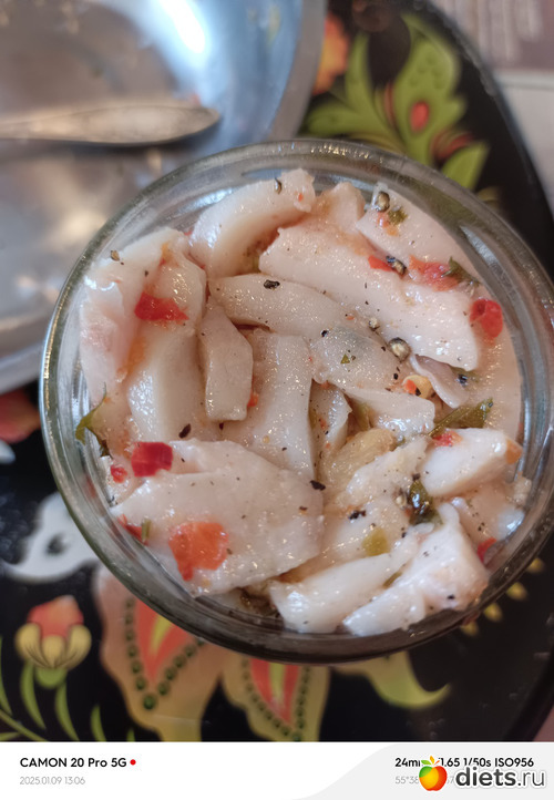 Порезала кусочками, засыпала специями, чесноком- через чесночницу, острый красный перец-стручками который- порезала, посолила и плотно, уминая, сложила в стеклянную банку.