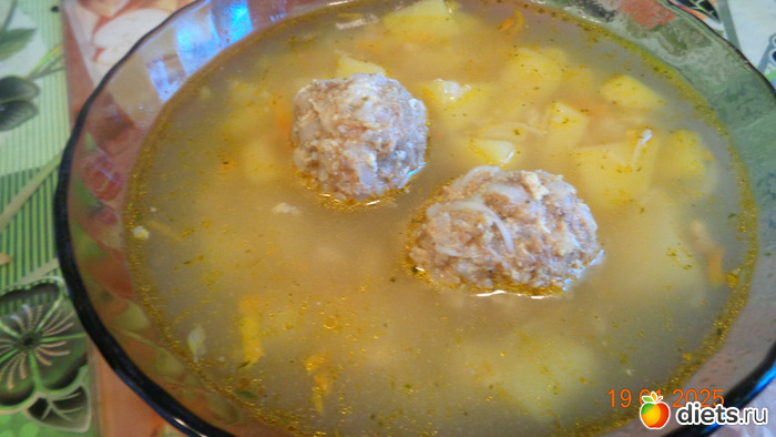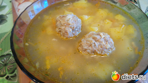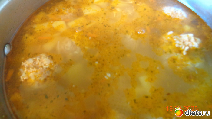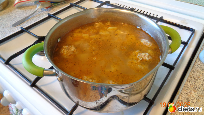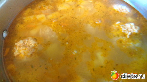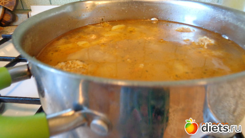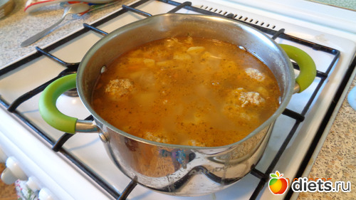 7. Выложим нарезанный картофель в кастрюлю к фрикаделькам. Будем варить 15 минут.