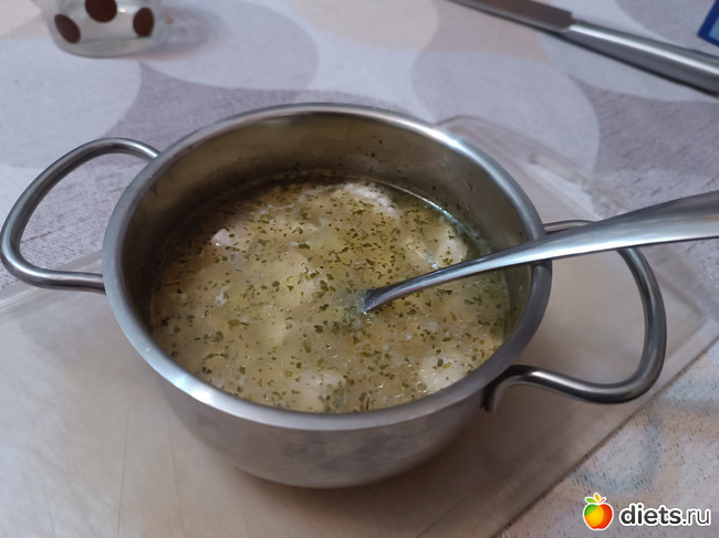 Ужин: суп на курином бульоне из 40 гр макарон-звёздочек и 120 гр куриной грудки.