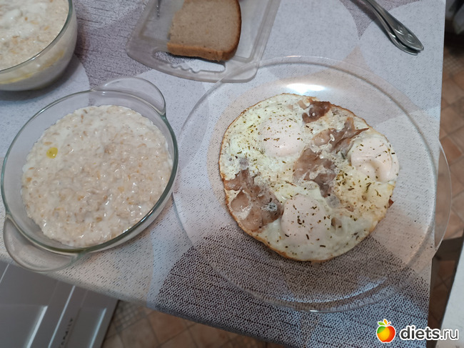 Завтрак: овсянка на 1/3 молоке (граммовку вообще не представляю, готовила на двоих), Яичница с беконом из 3 яиц и 2 ломтиков бекона.