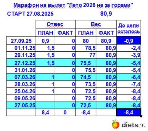У меня есть 9 месяцев чтобы без вреда для физического и психического здоровья сбросить 8.4 кг и достичь цели 72.5 кг, ОТ 85 см (в идеале 80 см).