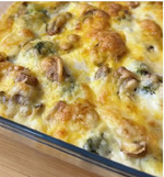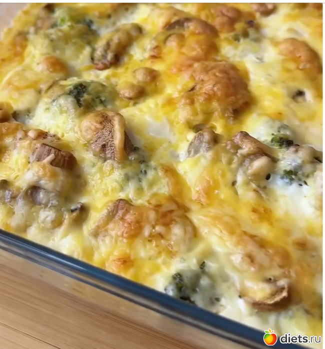 1. Брокколи предварительно размораживаем или берем свежую. Добавляем куриную грудку нарезанную кубиками, свежие шампиньоны нарезанные слайсами. Солим и перчим.