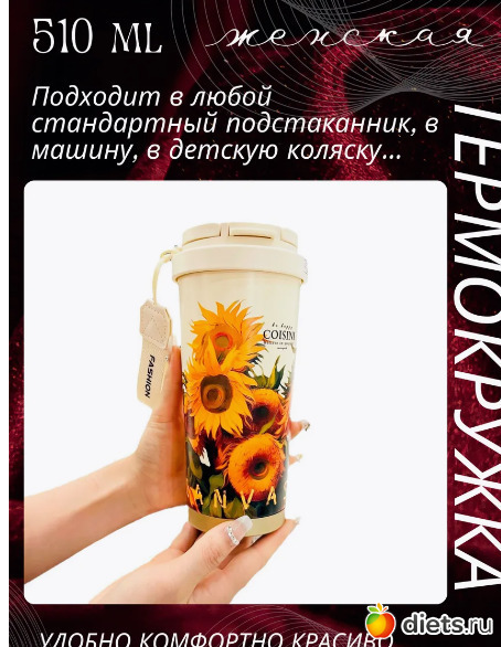 Кружка очень удобная, на 500мл, я только куплю ремешок побольше для руки, чтобы было удобно. Есть отверстие как у кофейной кружки, чтобы пить, есть трубочка, все герметично закрывается и не проливается. А еще ситечко для заваривания чая есть! Я такое впервые встретила в кружке! Сегодня с ней ездила в Ялту, балдела)))