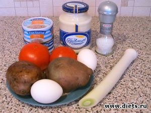 Смешать рыбу, картофель, помидоры, яйца, лук, немного посолить.