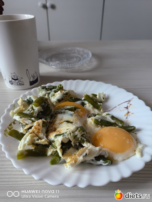 Кофе, карбонад, чернослив, яичница со стручковой фасолью и сыром, зефир, котлеты из трески, капуста с маслом, творог.