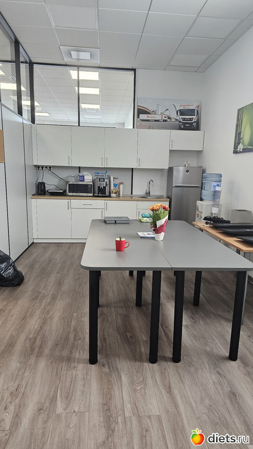 Новый офис выглядит светлым. Места уже распределили, удобное тебе досталось? Кухня отличная
