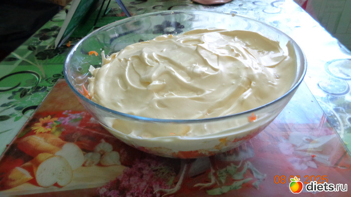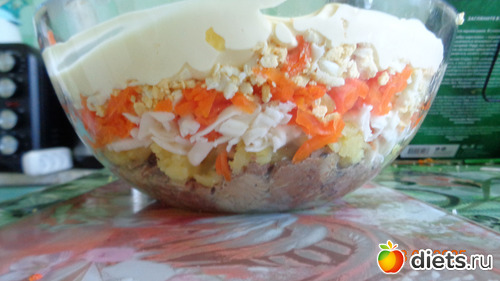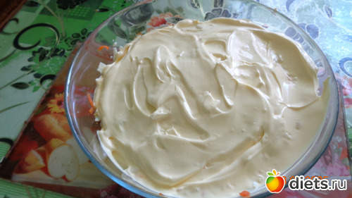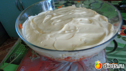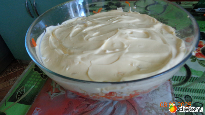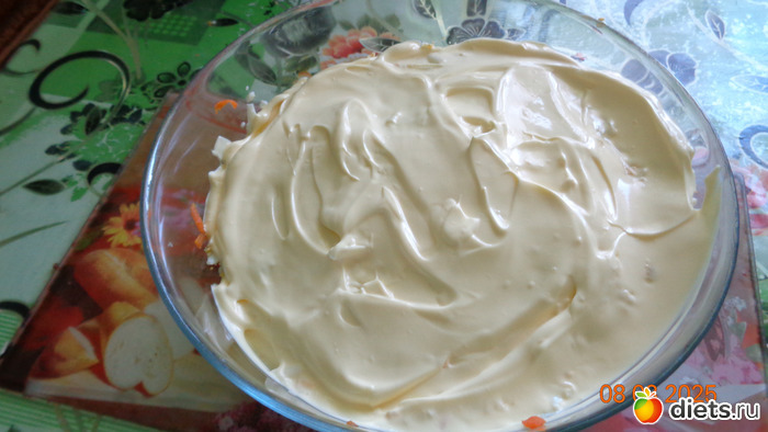 5 Очищенный и натертый на крупной терке картофель выложите и покройте майонезом. Это будет первый слой.