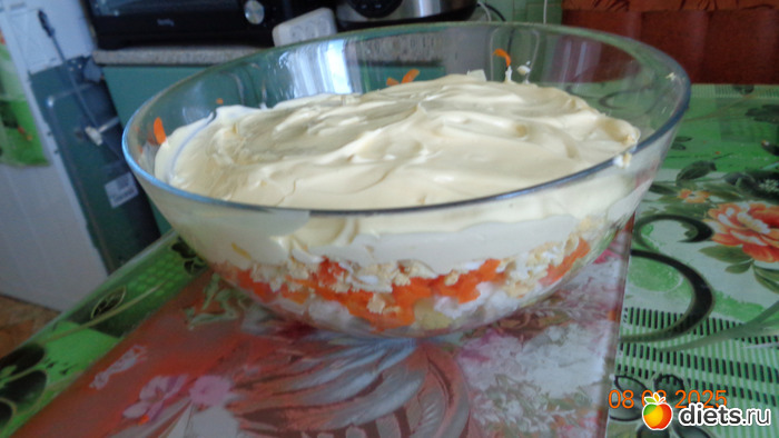 8 Отделите от яиц белок и натрите на мелкую терку четвертым слоем салата. Смажьте сеточкой майонеза.
