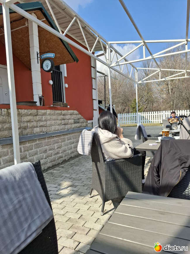 Причём, на улице. И хоть на стульях пледы висели, они не потребовались, но я не стала рисковать, сидела в куртке