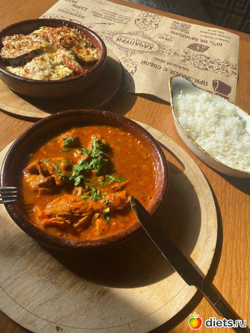 Заказала баклажаны, запеченные под сыром сулугуни, чахохбили и рис. Понятно, что все не съела. Часть принесла домой, на ужин.