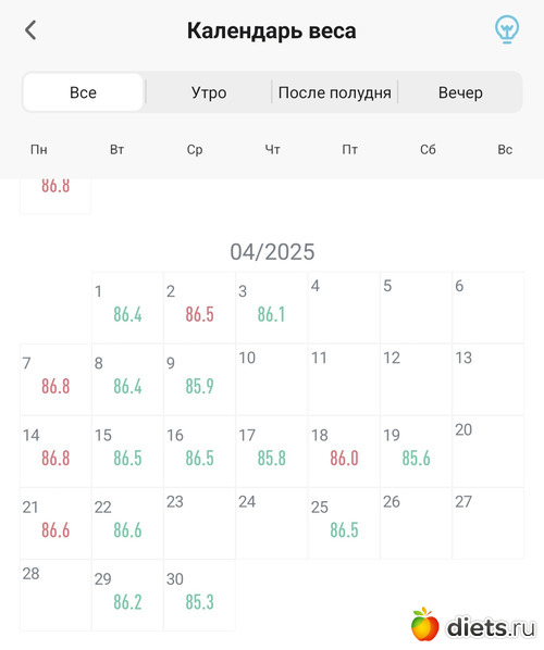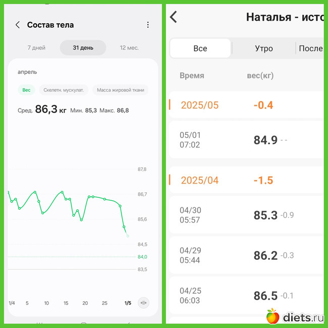 средняя за месяц так себе, но в май я вошла с 84.9 кг
