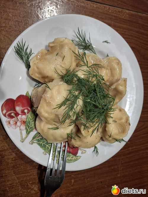 Пока выдернула траву, пока вскопала, пока посадила-полила. Надеюсь свои +0,8 кг я израсходовала. Приехали домой уж поздно, но кушать хочется, а готовить было некому. И вместо запланированной рыбы были вареники с картошкой 340г на 550кал