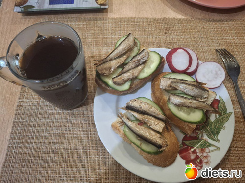 тосты (60г), огурец, редис (150г), шпроты (56г). Итого завтрак 329кал