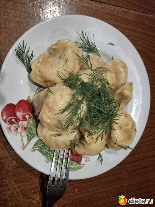 Пока выдернула траву, пока вскопала, пока посадила-полила. Надеюсь свои +0,8 кг я израсходовала. Приехали домой уж поздно, но кушать хочется, а готовить было некому. И вместо запланированной рыбы были вареники с картошкой 340г на 550кал