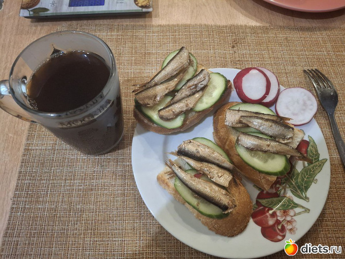 тосты (60г), огурец, редис (150г), шпроты (56г). Итого завтрак 329кал