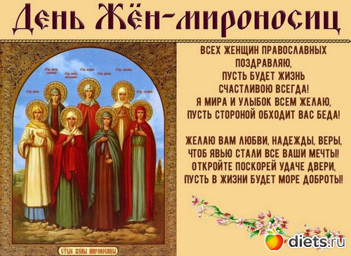 День Жён-мироносиц - светлый и наполненный радостью праздник. Он воистину славит женскую чистоту и самоотверженность, целомудрие и супружескую верность как наивысшие блага и непременные каноны.
