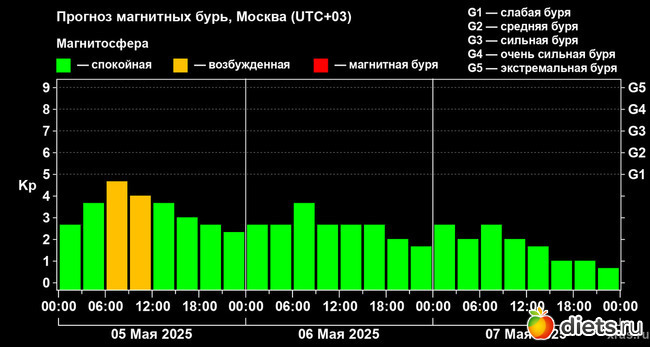 Другой источник - Сегодня, 5 мая 2025 года, в понедельник, геомагнитная активность на Земле будет относительно спокойной,