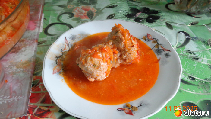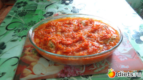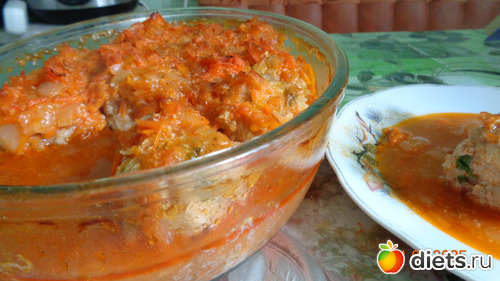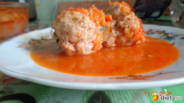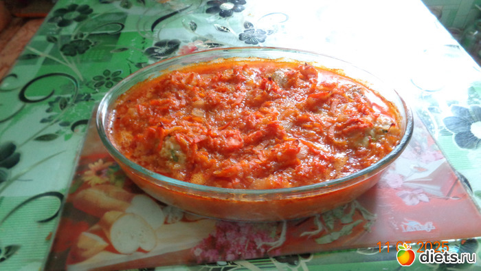 Упрощённый способ приготовления тефтелей - без предварительной обжарки. Формируем тефтели из говяжьего фарша с луком, зеленью и отварным рисом, готовим соус-заливку из обжаренных овощей и томатной пасты - и запекаем всё вместе в духовке.
