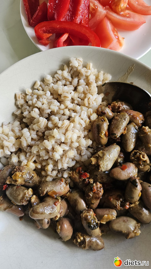 О: перловка, куриные желудки, помидор, перец, кофе капсула