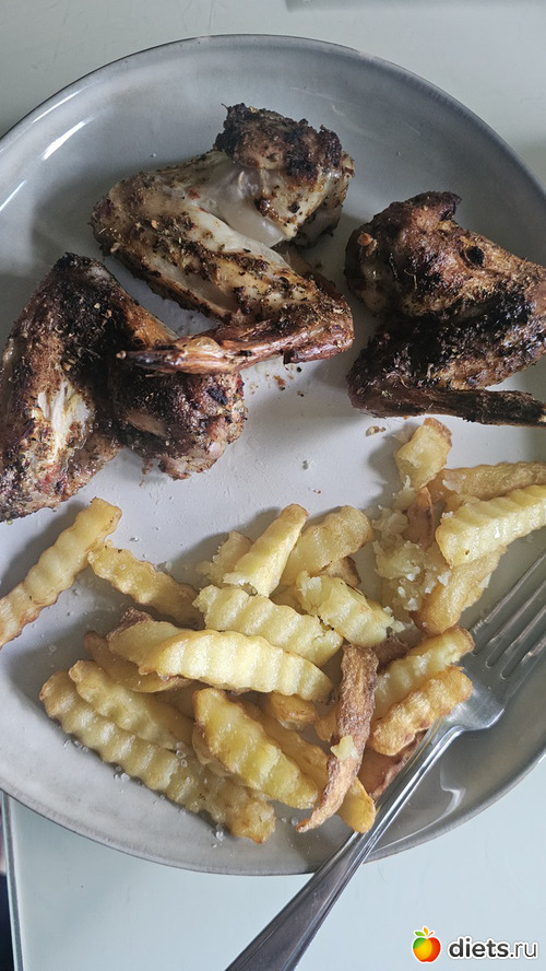 У: крылья, пожареные в духовке, салат огурец+помидор (на фото картошка фри не моя, а салат не попал. Только такое фото есть. Картошку с тарелки у меня отжали