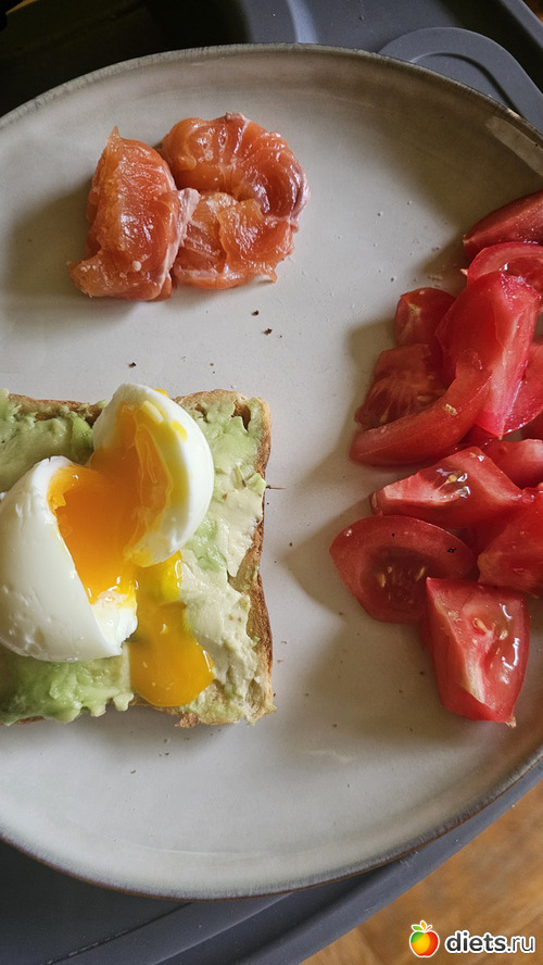 О: хлебцы, лосось, яйцо, авокадо, помидор
