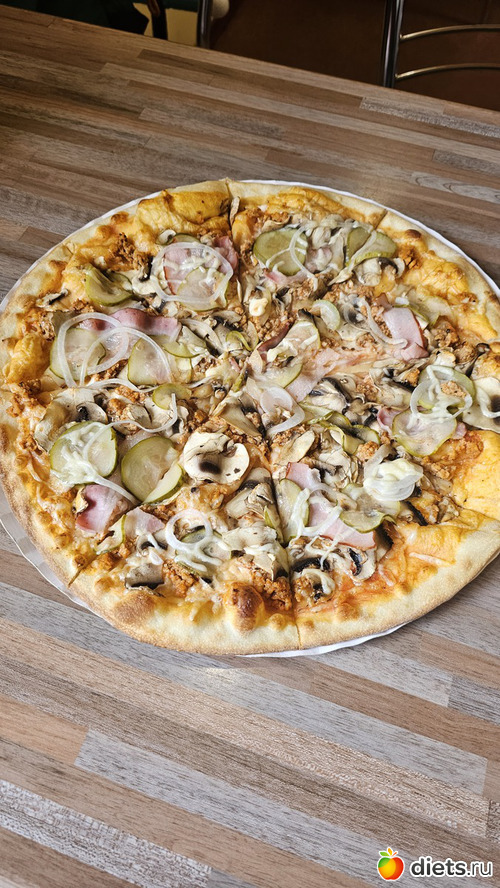 О: пицца в пиццерии. Сколько сьела, не знаю, втроем ели 2 пиццы по 32 см, в основном два других едока налегали, я не любитель. Записала 1000 ккал