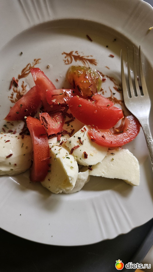 У: салат капрезе, рисовые макароны с грибами