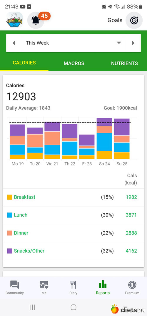 Это гораздо меньше, чем в предыдущие недели, тогда было: 2148, 2099 и 2374 ккал