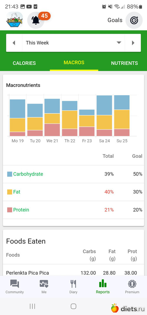 Неизменная тенденция: больше ккал в выходные, перебор по жирам и белкам, недобор углеводов