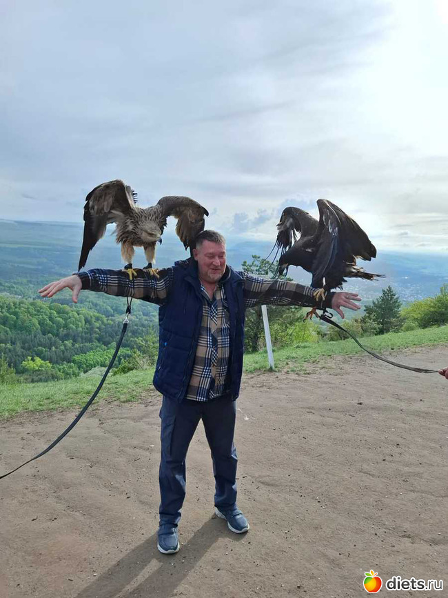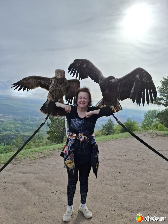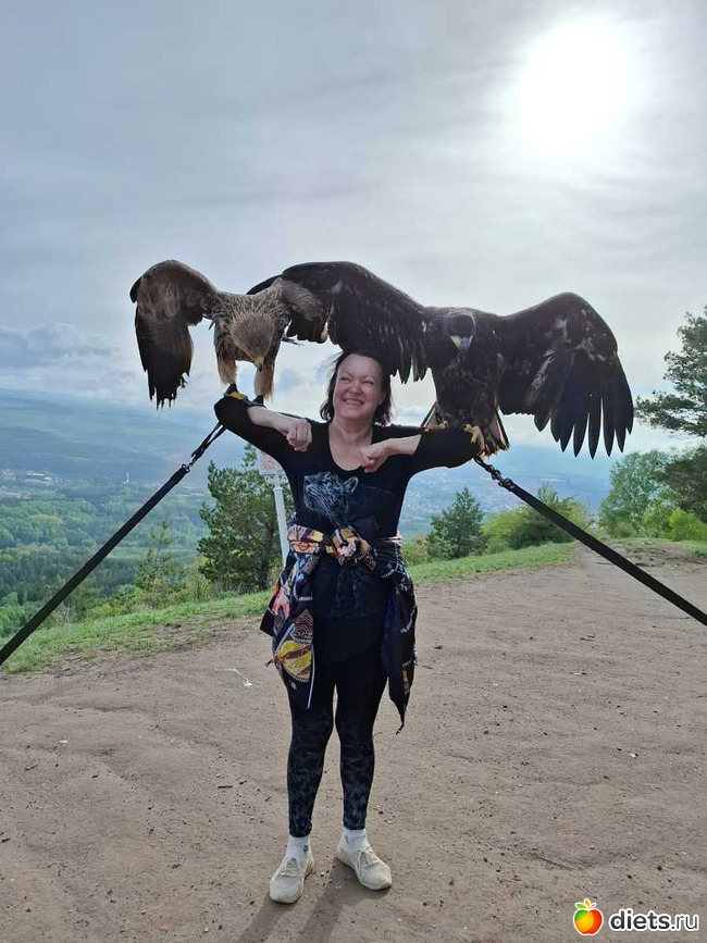 Ты так постройнела. На фото с птицами хорошо заметно. Страшно было фотографироваться? Видно, прямо рядом с лицом клюв.