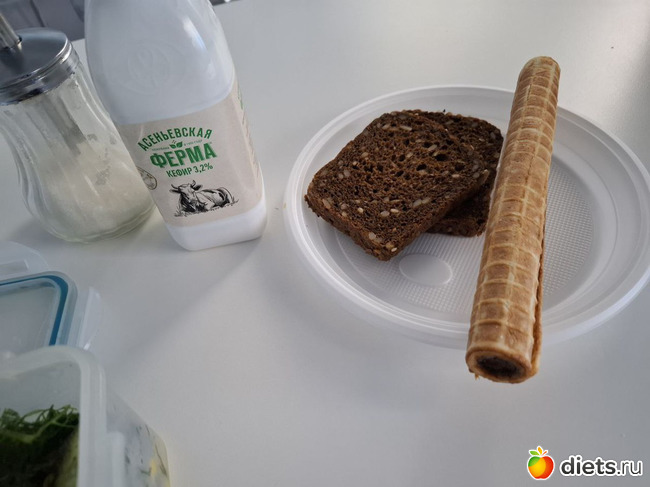 Завтрак: овсянка в банке (овсяные хлопья долгой варки, ягоды из маминого компота, кефир 2,5%). 1 варёное яйцо. Чипсы из свинины (с фермерского рынка) – их съела на перекус уже в 11. Трубочка со сгущёнкой с кофе. 2 беляшика из староморозильных запасов.