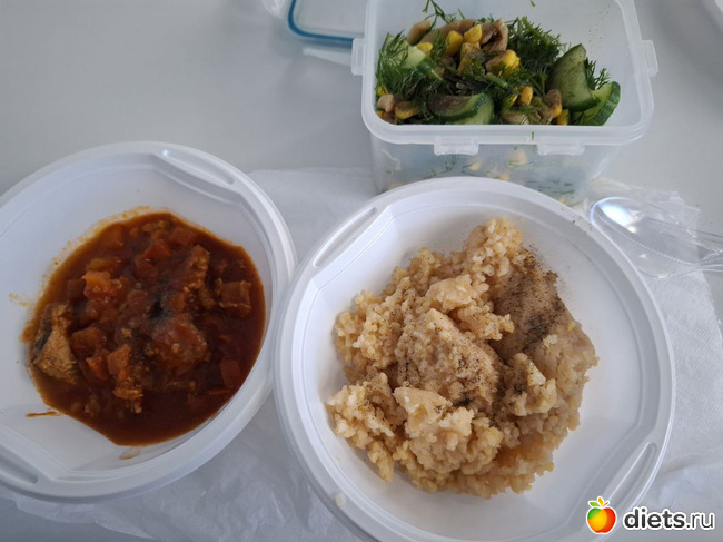 Обед. Горох из пакетика (опять наварила и наморозила гарниров), лосось с овощами консервированный, салат: кукуруза, огурец, укроп, мидии в масле, кальмар консервированный. На десерт – кефир и трубочка со сгущёнкой.