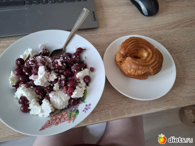 2-й завтрак: творог 5%, ягоды из маминого компота. кольцо с творогом. Сегодня я что-то оторвалась по сладкому, наелась от пуза