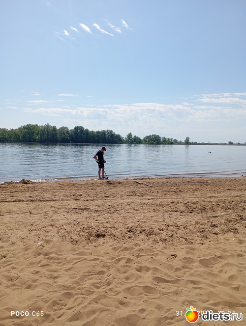 Искупалась и еще буду. Но это вам не пруд, не поплаваешь. Вода градусов 16-17. По моим ощущениям скорее 16. Но окунуться пару-тройку раз можно и нужно. Кайф! Бодрит неимоверно. Искатель ходит с прибором, пикает им в надежде найти что-то ценное. Пока ничего не нашел, но роется в песочке с увлечением. Хорошо здесь, от Волги прохладой веет. Муж в тенечке сидит