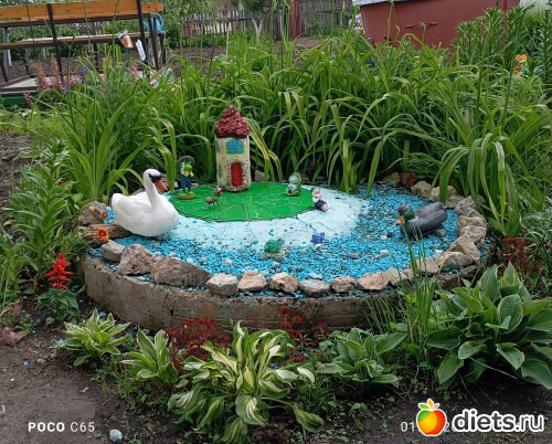 Тысячелистник на новом месте стоит как всегда рос. Хорошо! но гуматом полила. пусть еще лучше ему будет. ПОдсадила гиацинтовые бобы и душистый горошек. Помыла сегодня сухой пруд, вчера покрасила люк-остров, сегодня расставила инсталляцию, подсыпала свежих цветных камушков, дикими камнями обложила. Новых лягух хорошо вписался в группу. Домик сама делала из 5 л бутылки, давно. Растентями тоже давно обсадила, чтобы именно с поддержкой основной идеи. Долго искала гнома-хозяина домика. Попался га Али гномик-рыбак. Лягушки с разных мвркет-плейсов. С прудом идея полностью моя, Все годы камушки сама красила, в этом году заленилась, купила готовых. Творю красоту как умею