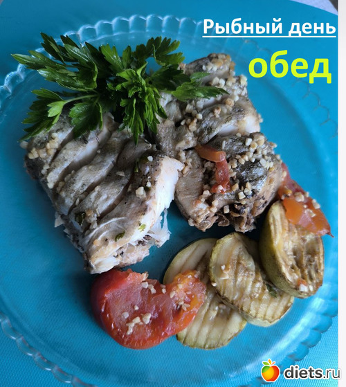 Обед запечённый минтай 300гр. ,кабачок 100гр. помидор 50гр.