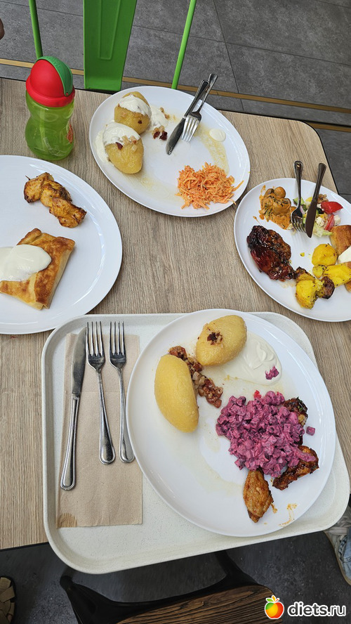Заезжали еще в тц за посылкой и решили поесть в кафе, где еда на вес. Накладываешь сам, что хочешь, цена фиксированная за сто грамм. На 4-х взяли: 4 цепелина, блинчик с ветчиной и сыром, блинчик с творогом, курицу терияки, крылья, куриный шашлык, картошку, грибы в сырном соусе, 3 салата. Маловато на 4-ых
